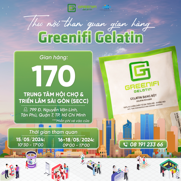 Mùa hè này, trân trọng kính mời quý khách hàng tham dự Triển lãm Quốc tế Lương thực Thực phẩm TP. Hồ Chí Minh để cùng trải nghiệm những khoảnh khắc “hẹn hò” thú vị và bùng nổ cùng Greenifi Gelatin. Đây là cơ hội tuyệt vời để Greenifi Gelatin được trực tiếp tương tác, lắng nghe và thấu hiểu những nguyện vọng của quý khách hàng.