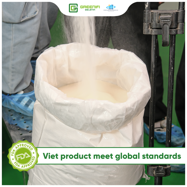 We proudly supply bovine gelatine powder with bloom strength ranging from 100 to 250 and mesh size from 8 to 20, entirely produced in Vietnam. Greenifi Gelatine products meet all international certifications, including GMP, FDA, ISO 22000:2018, and come with a COA adhering to the Vietnamese Pharmacopoeia standards, ensuring exceptional safety and quality.