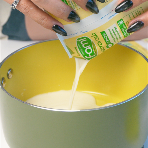 - Cho sữa đậu nành, sữa tươi không đường, whipping cream và đường trắng vào nồi.