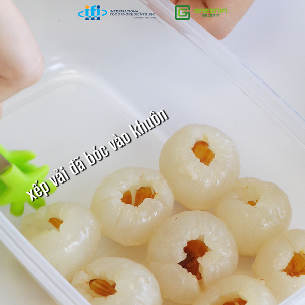 Xếp các múi vải đã bóc sạch, bỏ hạt vào khuôn/hộp. Lưu ý để phần mặt vải hướng lên trên và xếp kín để khi rót khúc bạch không làm vải bị xô lệch.