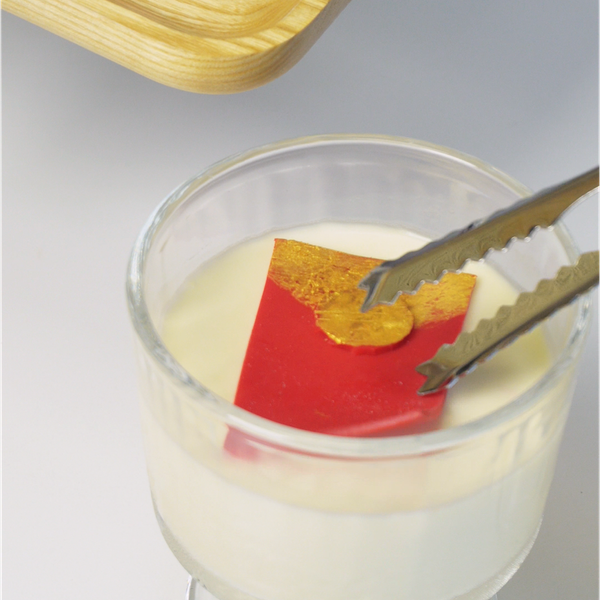 Cuối cùng, nhẹ nhàng đặt bao lì xì lên bề mặt panna cotta đã đông hoàn toàn để hoàn thiện món tráng miệng.
