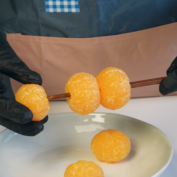 Bước 2: Dùng một chiếc đũa hoặc xiên tre xuyên thẳng qua tâm của quả quýt. Việc này giúp cố định quýt thẳng hàng, khi cắt ra lát thạch sẽ có hình bông hoa đối xứng hoàn hảo.