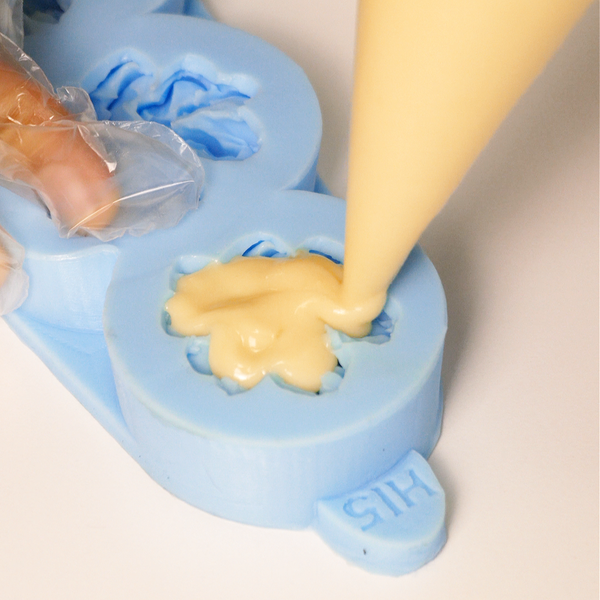 Cho hỗn hợp vào túi bắt kem. Cắt đầu túi vừa phải và bơm trực tiếp vào khuôn silicon hình hoa.