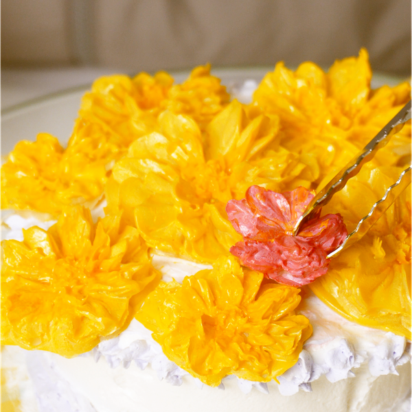 Sau khi bơm kem xong, bạn nhớ lấy một chiếc tăm nhỏ chọc nhẹ, di kỹ vào các kẽ cánh hoa sâu nhất. Thao tác này giúp kem lấp đầy mọi ngóc ngách. Không làm kỹ bước này là hoa sẽ dễ bị mất cánh, hoặc bị rỗ mặt tiền.