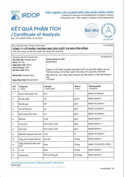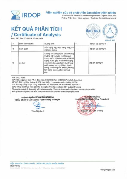 3. Kết quả phân tích sản phẩm Greenifi Gelatin theo tiêu chuẩn Dược Điển V chứng nhận bởi Viện Nghiên cứu và phát triển sản phẩm Thiên Nhiên (IRDOP)