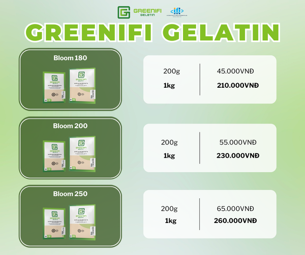 Greenifi cung cấp dòng gelatin bloom 180–200 – mức bloom lý tưởng để tạo cấu trúc định hình, ổn định và dẻo dai cho các sản phẩm như:
