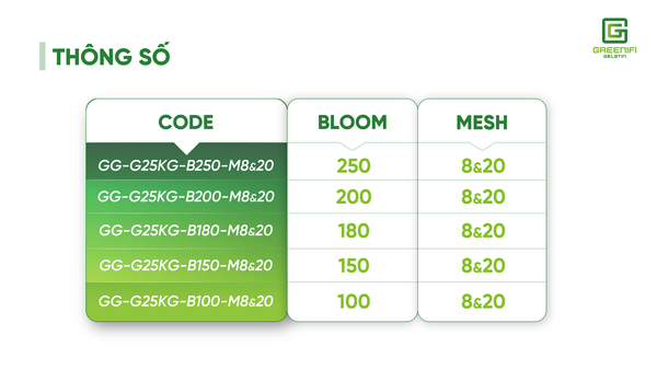 - Đa dạng độ bloom từ 180 tới 250, phù hợp trong sản xuất và chế biến nhiều loại thực phẩm: kẹo dẻo, thạch, giò chả, xúc xích, surimi,...