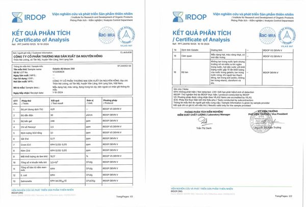 COA theo từng lô hàng (Greenifi Gelatin - Bloom 250)