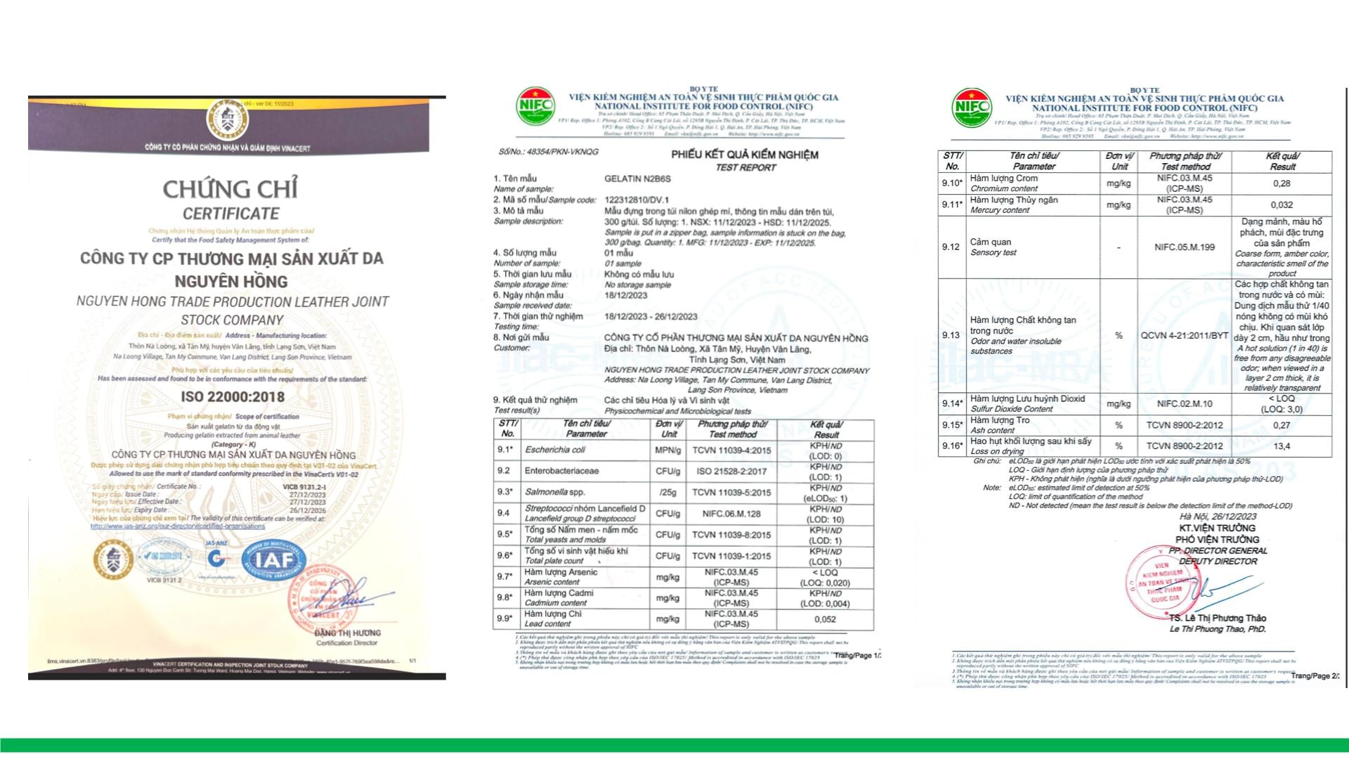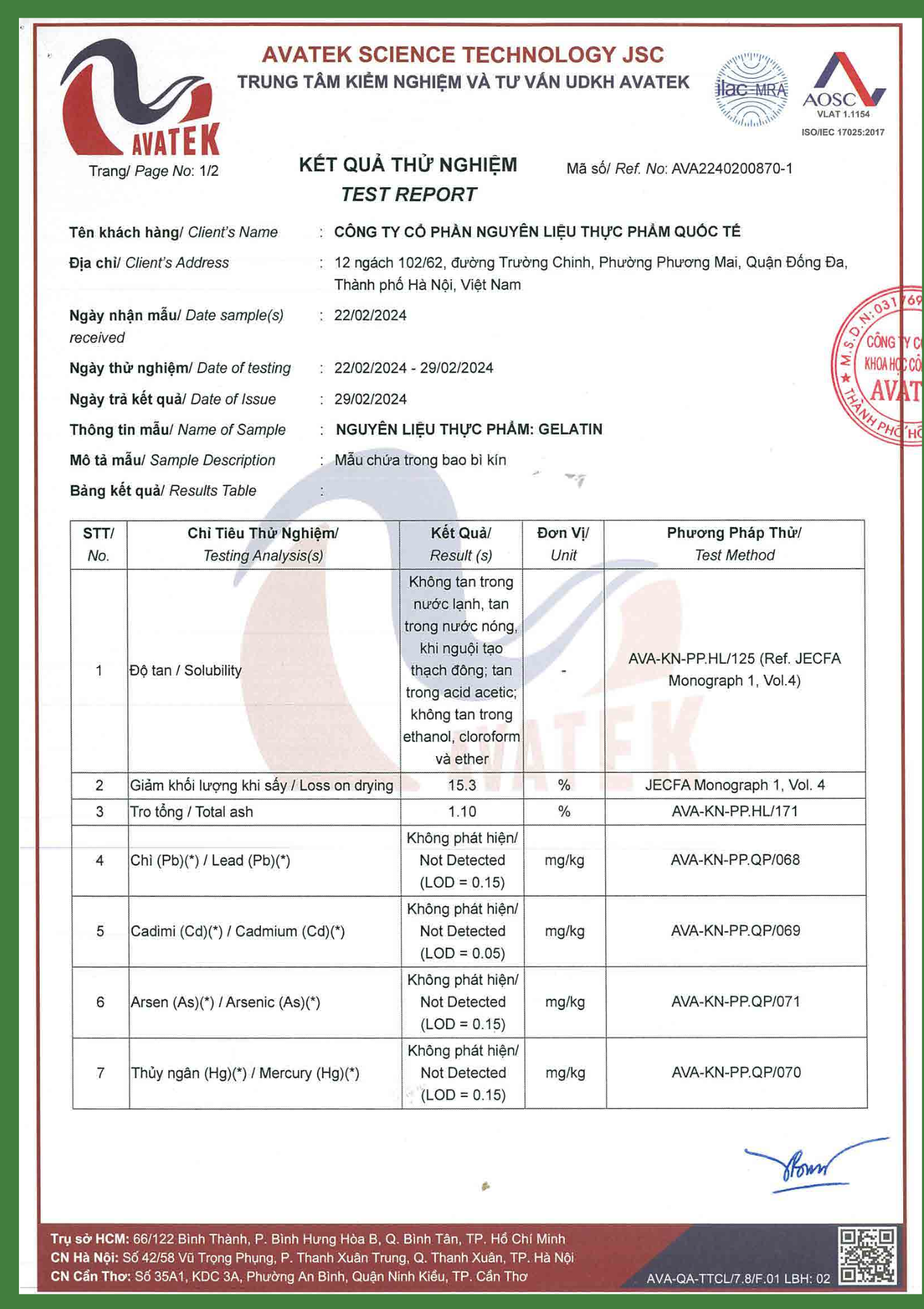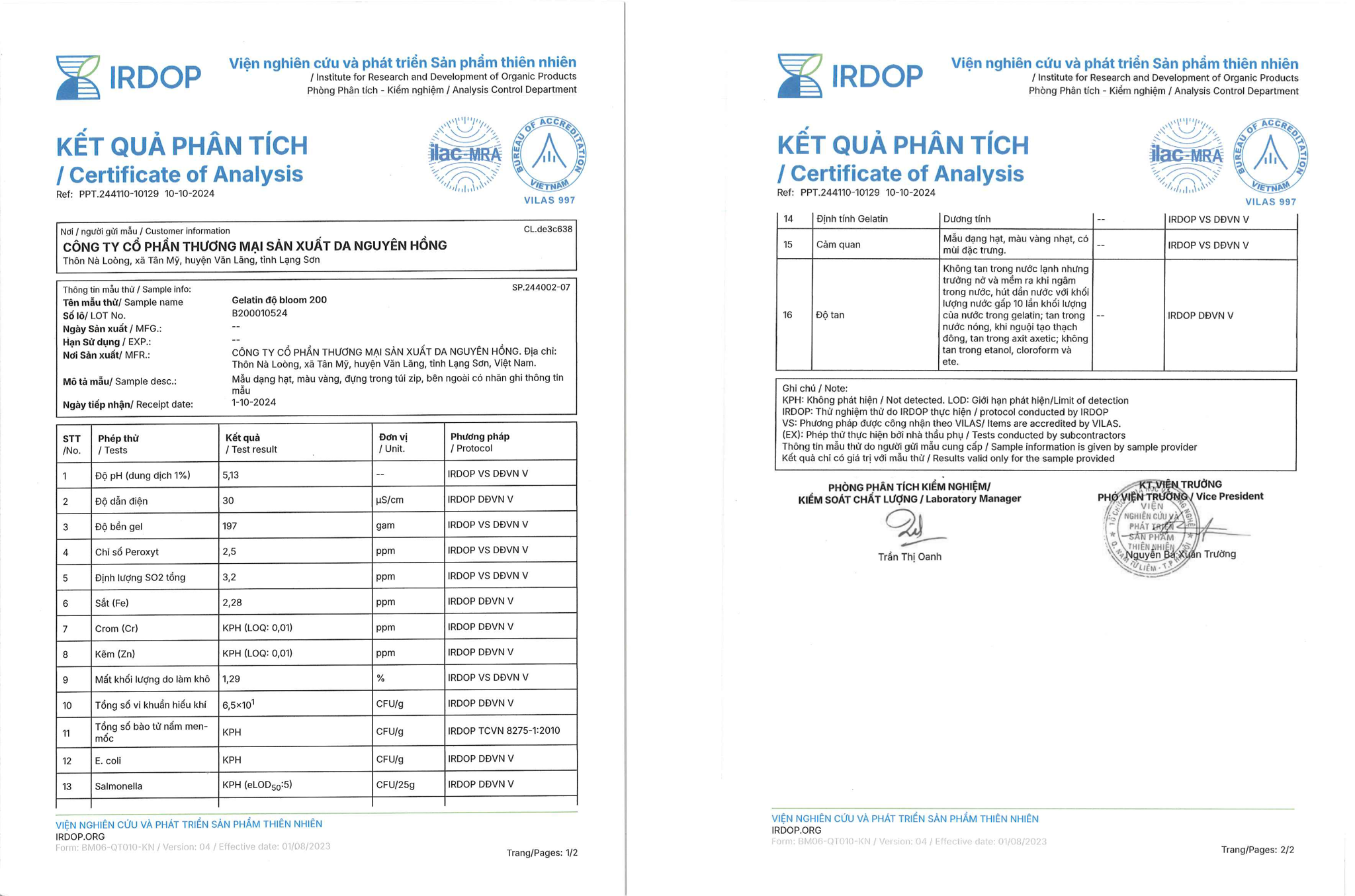 COA theo tiêu chuẩn dược điển Việt Nam V (Greenifi Gelatin - Bloom 200)