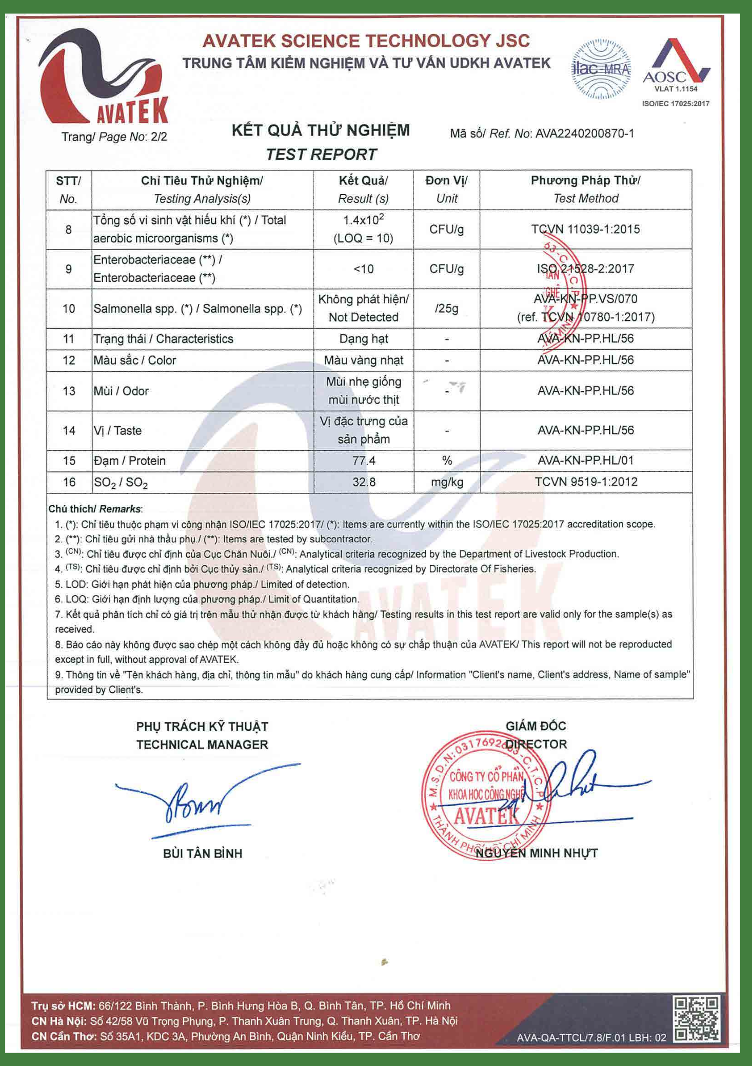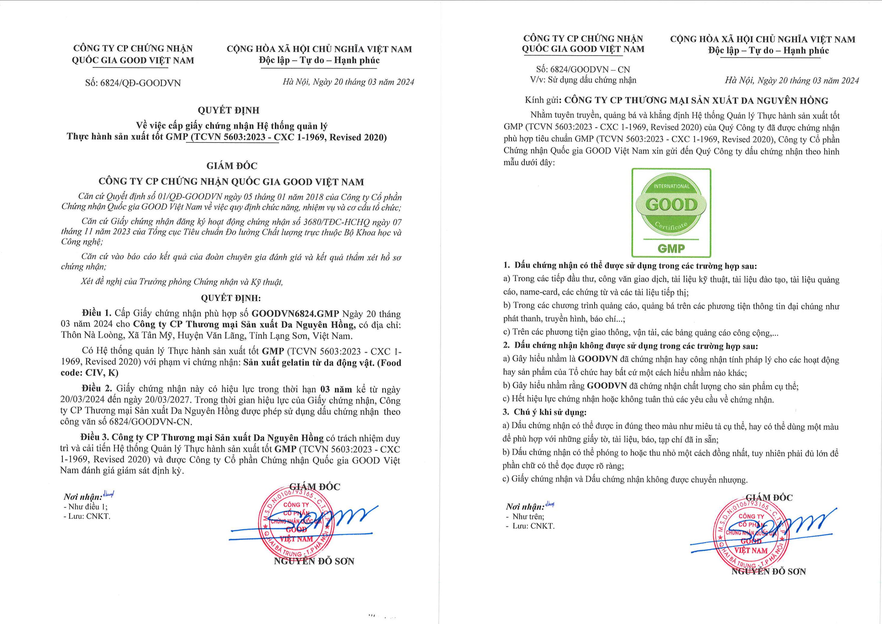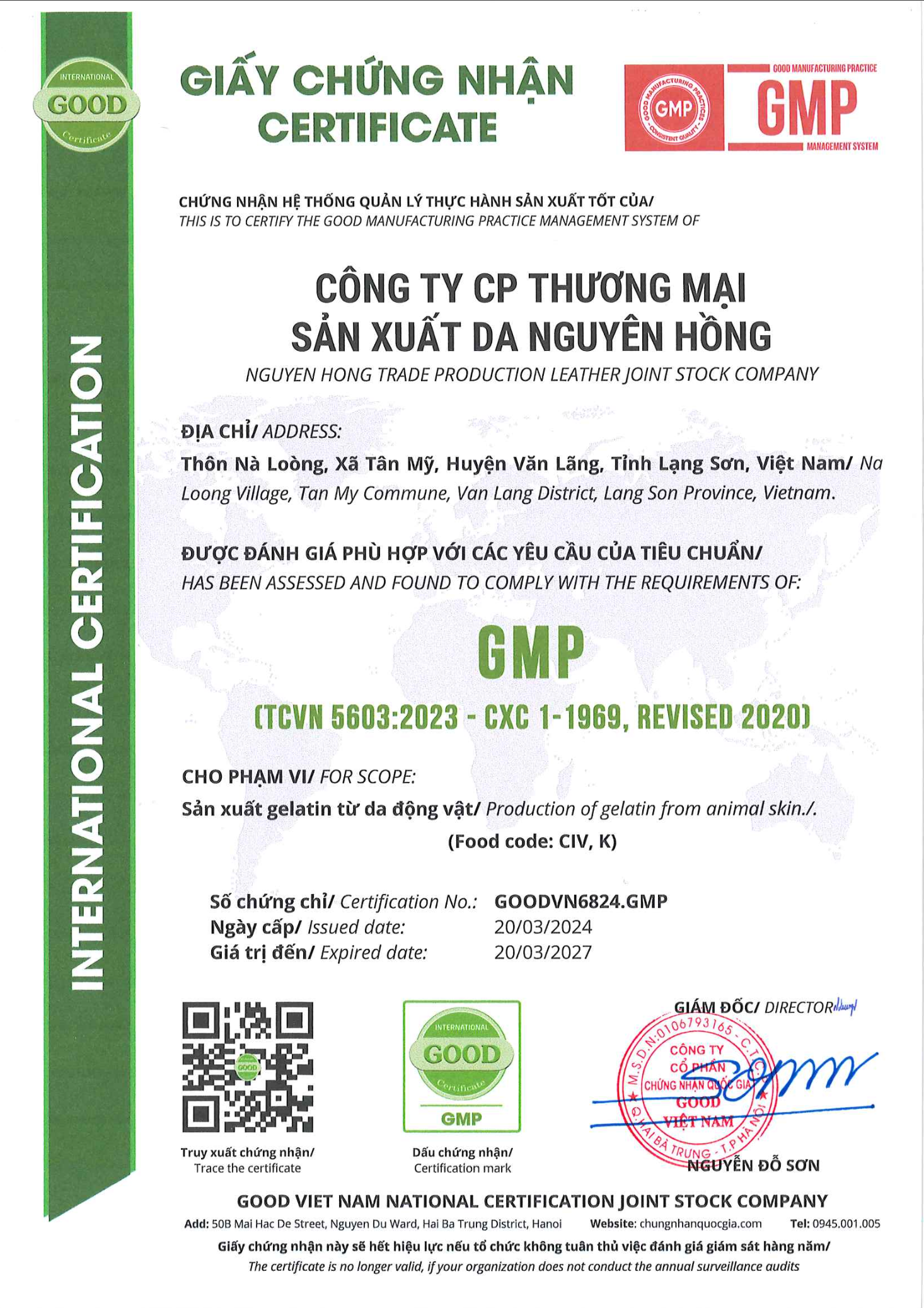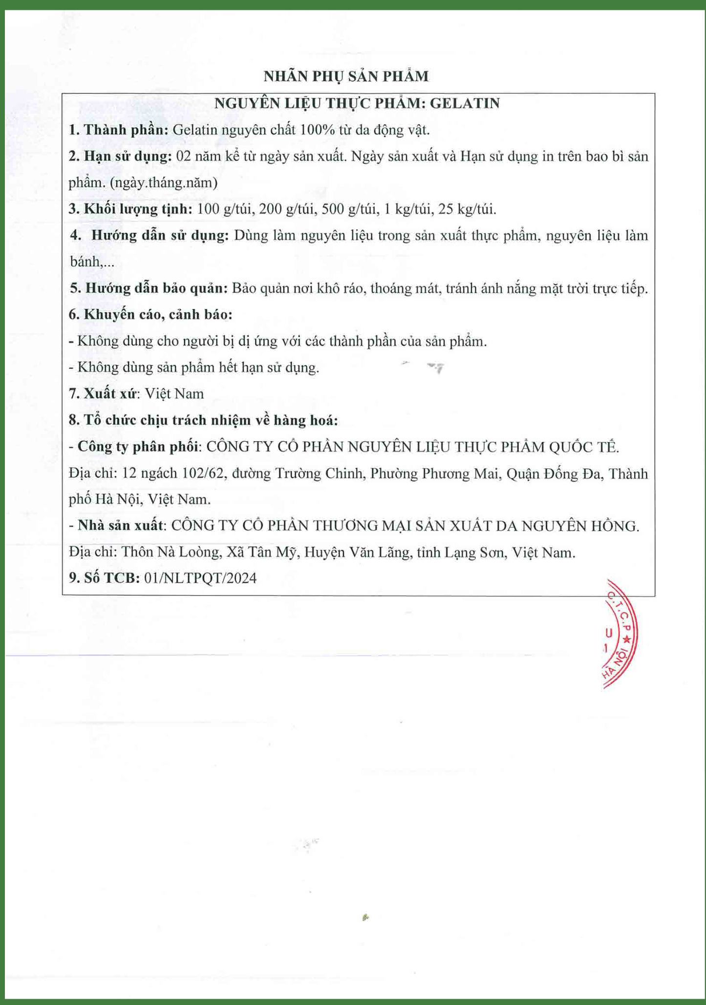 COA theo tiêu chuẩn dược điển Việt Nam V (Greenifi Gelatin - Bloom 200)