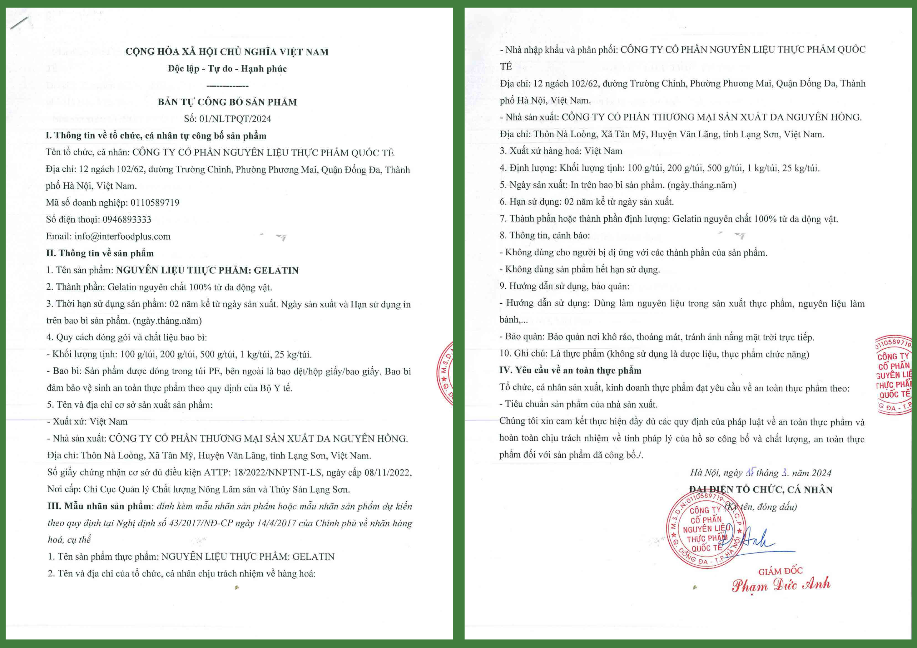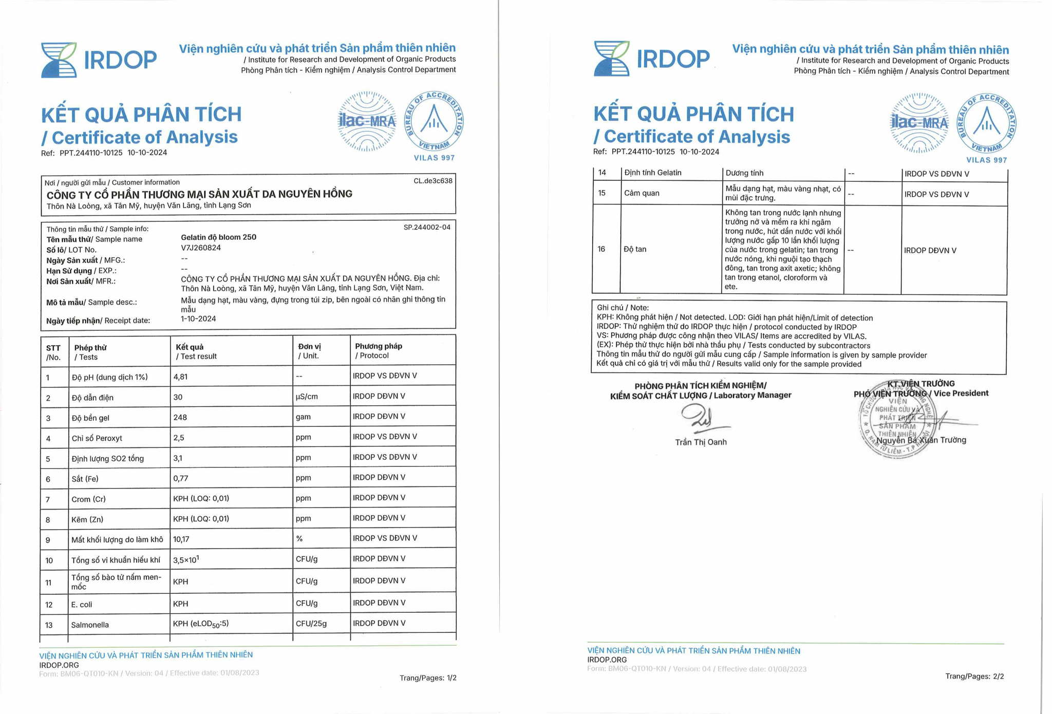COA theo tiêu chuẩn dược điển Việt Nam V (Greenifi Gelatin - Bloom 250)